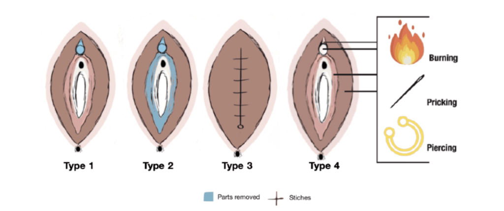 Type 4: All other harmful procedures to the female genitalia for non-medical purposes. For example: pricking, piercing, incising, scraping and cauterizing (burning the flesh with a heated instrument) the genital area.